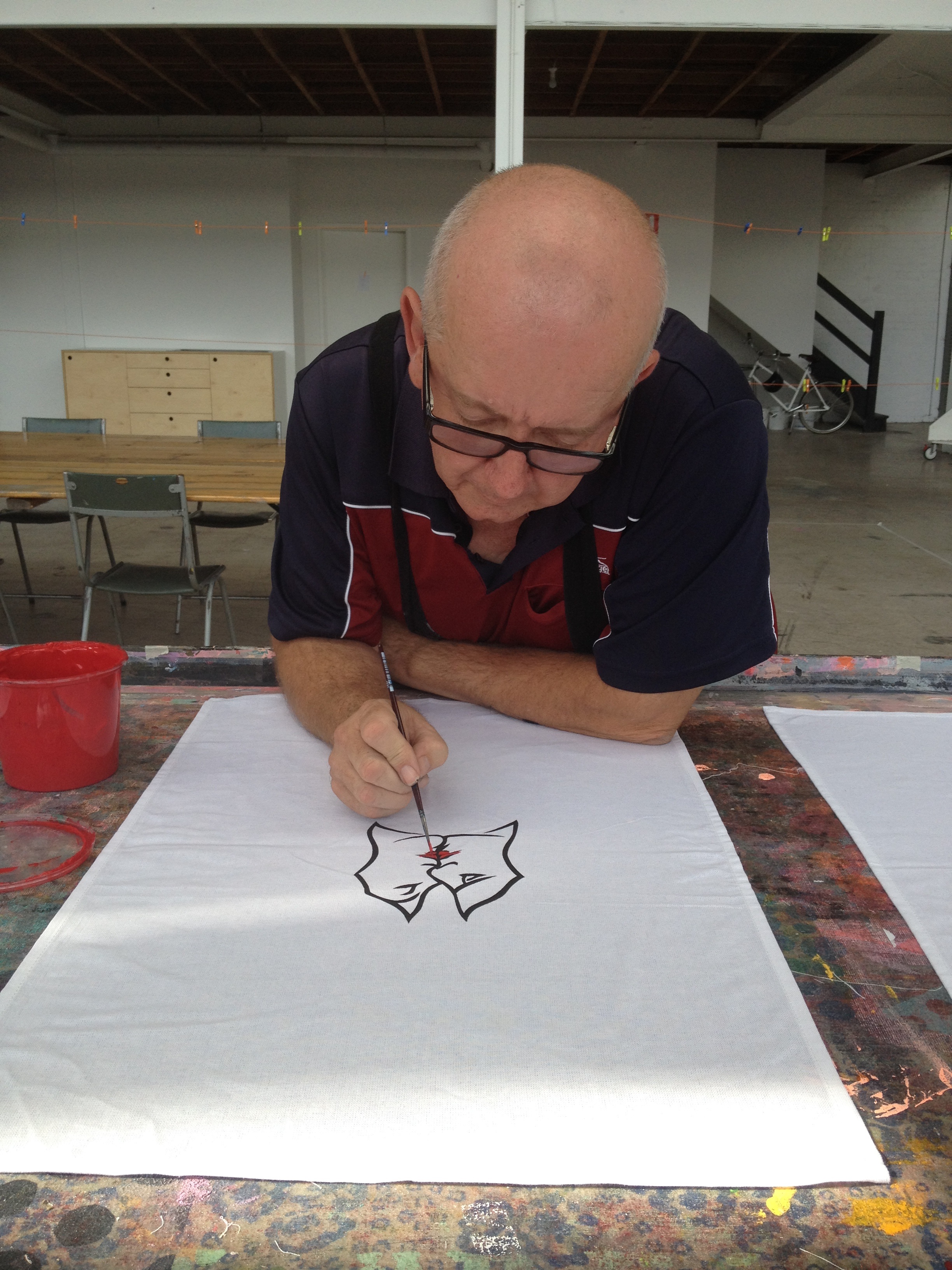 My son Lucas and I at the screen-printing stage then the drying stage.