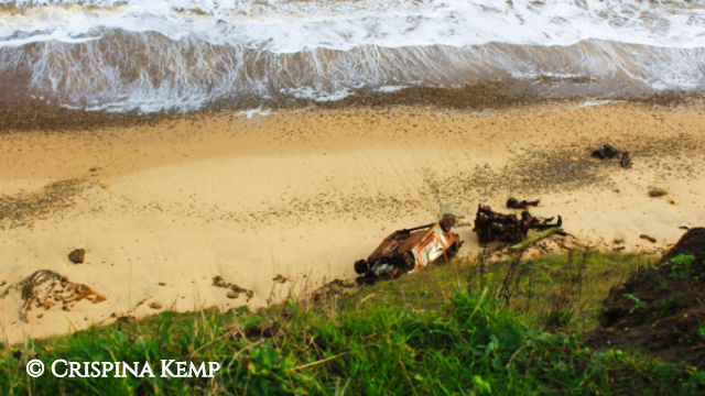 I don’t know if this was dumped. It could have been parked there, all legit when the cliff crumbled. After all, there are remains of houses hanging on those cliffs too